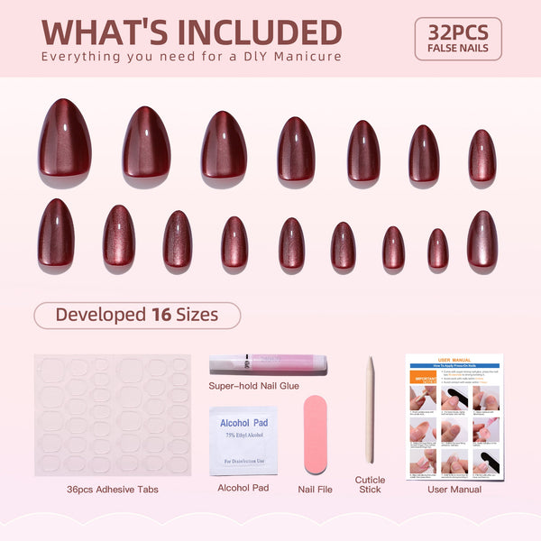Jedes Set enthält 16 verschiedene Nagelgrößen für eine individuelle Passform sowie Nagelkleber, Klebelaschen, eine doppelseitige Feile und einen Nagelhautstift – alles, was Sie für eine einfache Anwendung jederzeit und überall benötigen!